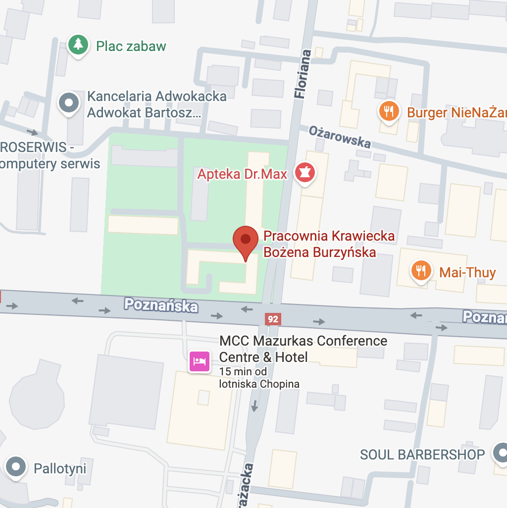 Pracownia prowadzona przez Bożenę Burzyńską jest od wielu lat obecna na rynku i świadczy kompleksowe usługi krawieckie. Siedziba pracowni znajduje się w Ożarowie Mazowieckim przy ulicy Poznańskiej 280 lok. 8A.